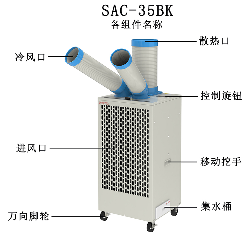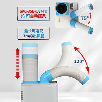 冷風(fēng)管可在一定范圍內(nèi)任意彎曲,大角度旋轉(zhuǎn)。兩根冷風(fēng)管均可左右自動擺風(fēng)。